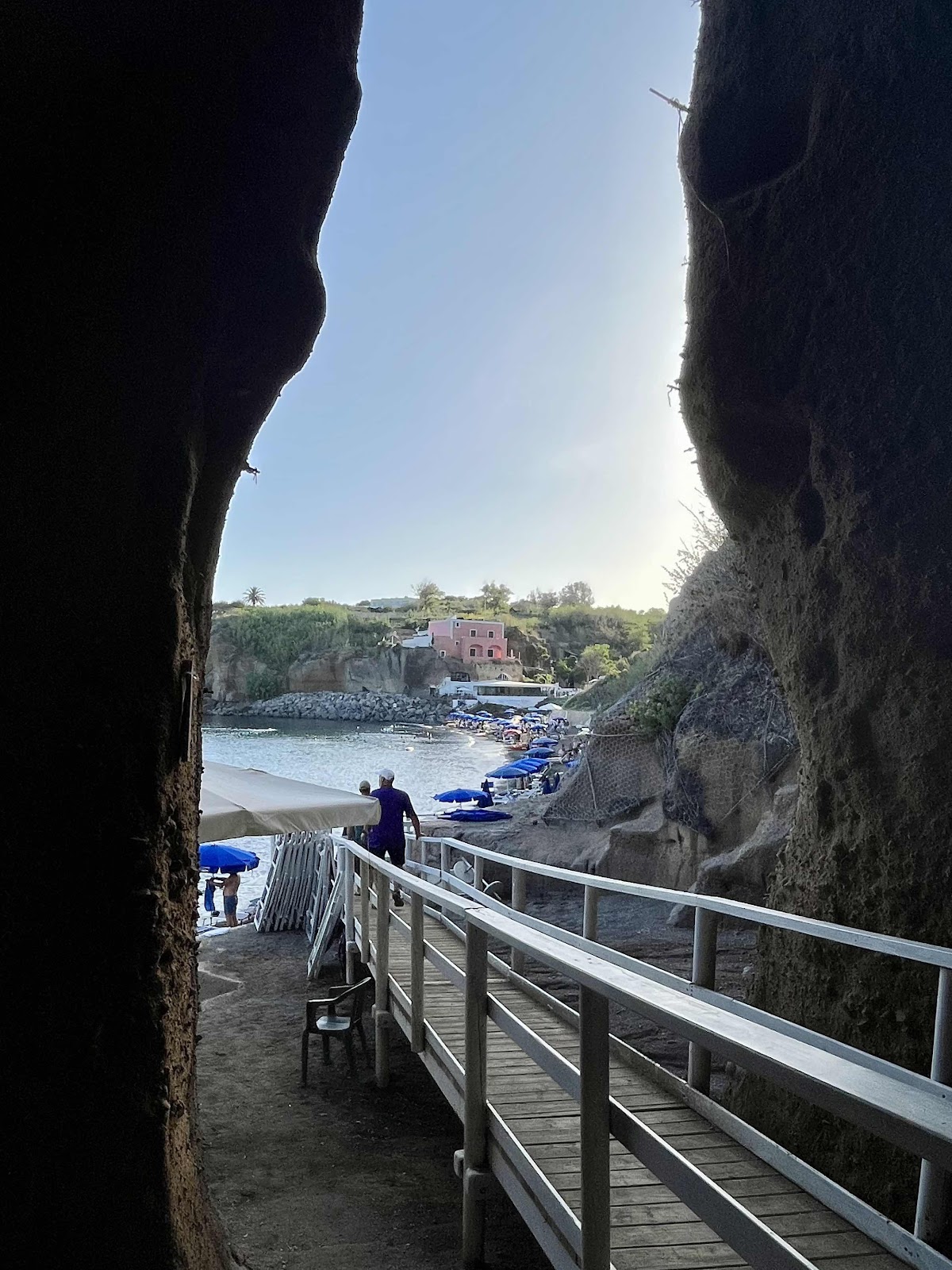 Ventotane has been worn down by the sea over millions of years and has left many caverns and caves. This tunnel connects the marina/town on the west to the east side….