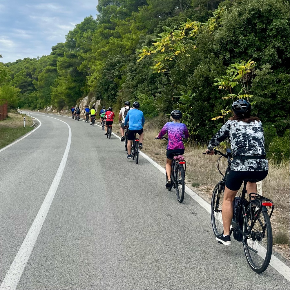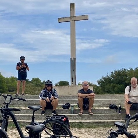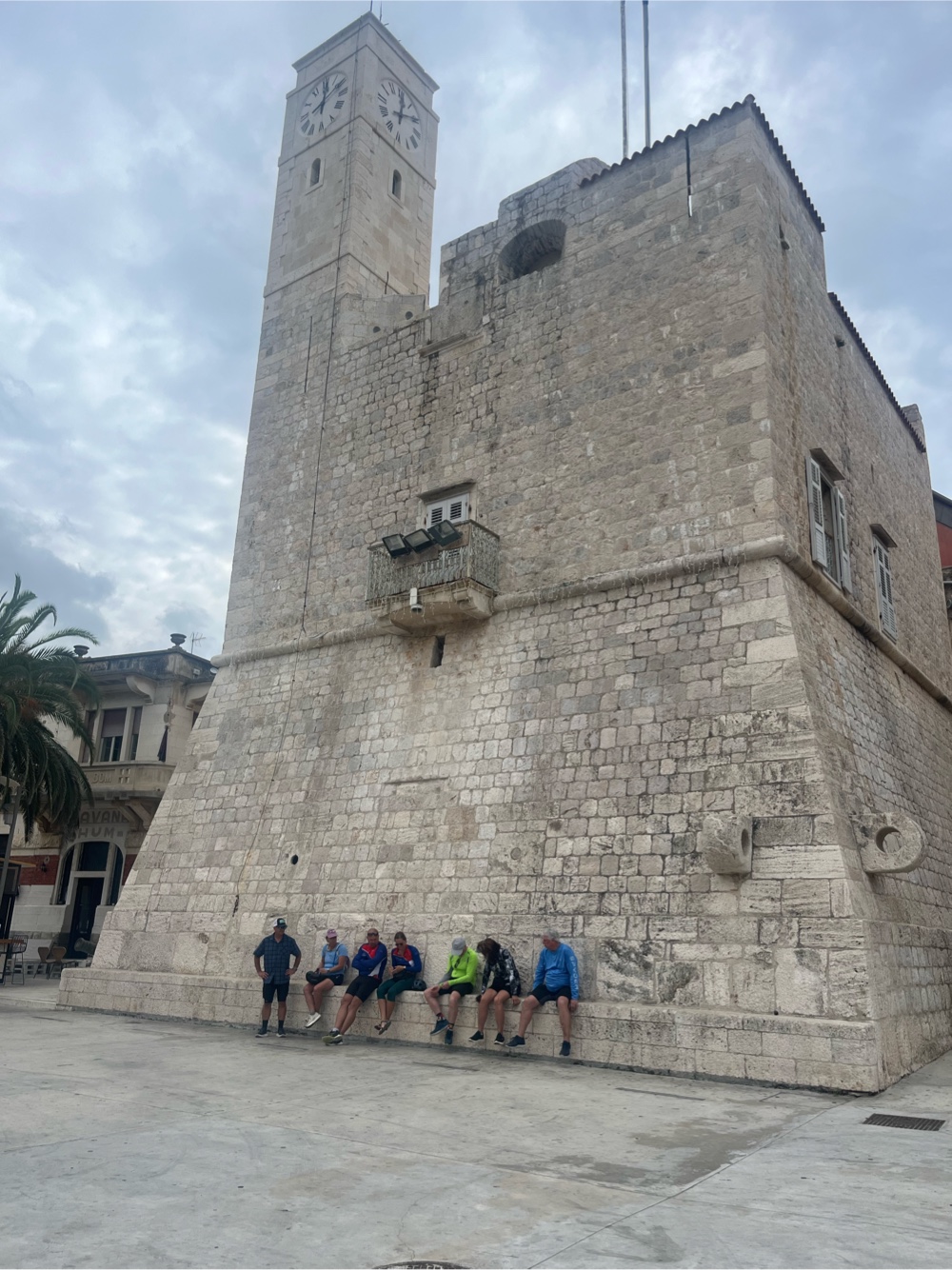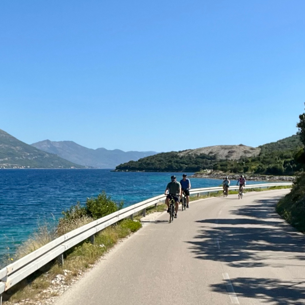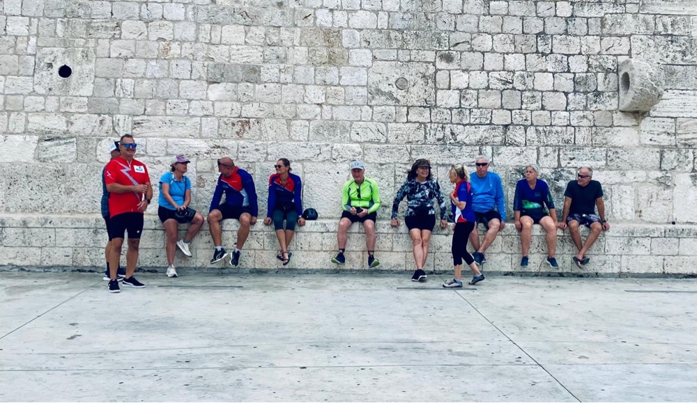 A short stop to gather the stragglers at Jujisco. You might notice there’s no fencing or barrier on this concrete roadside pad to prevent someone from falling about 8’ off the back. Many times on our rides there is a 1 to 3’ drop off of the side of the road. It pays to pay attention and be careful when bike riding in Croatia.