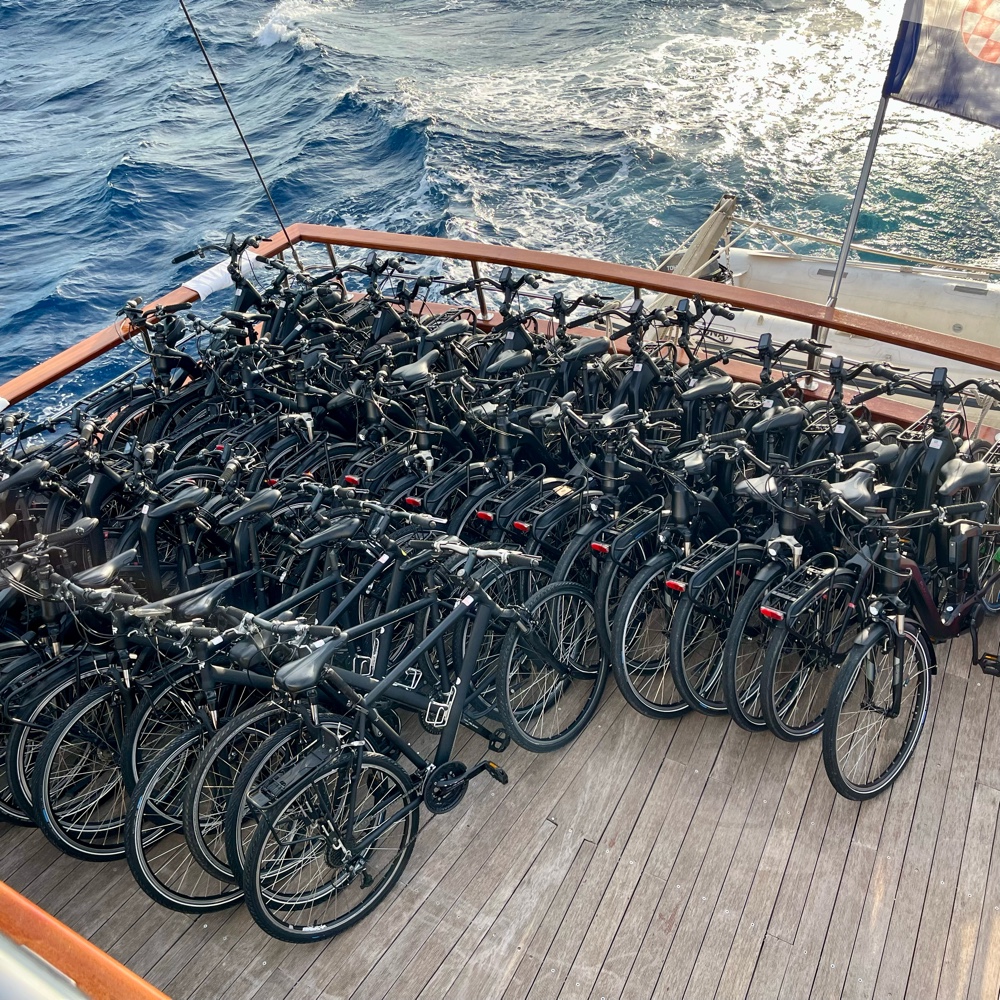 Where our 30+ bikes live when they’re not being ridden. The crew sets up “bucket brigade” every day to convey the bikes up and down to the dock.