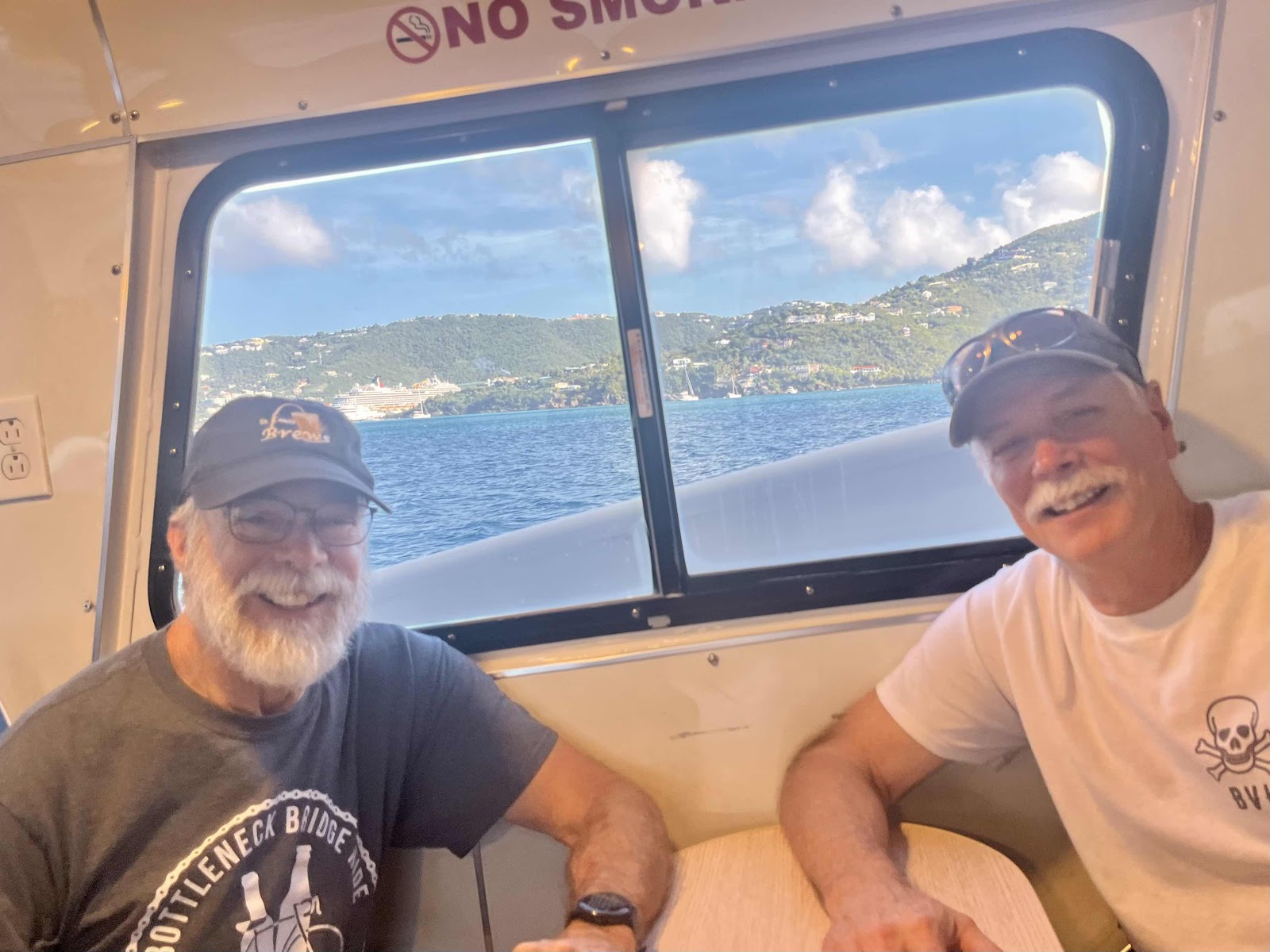 Thursday morning we embraced the ocean on a ferry from Charlotte Amolie in the US to Road Town on the island of Tortola in the British Virgin Islands. It was about an hour of pretty high speed boating where we seemed to become airborne for about a second before a hard landing on the ocean. John, Jim and I learned to hang on, just in case.